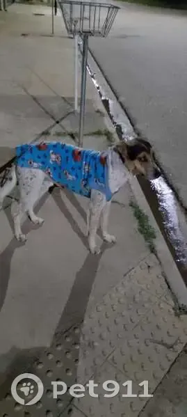 Encontrado com roupinha e uma casinha quebrada. É de porte grande, estava com muito medo, um pouco magro mas bem tratado, apesar de pulgas e carrapatos.