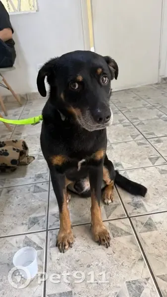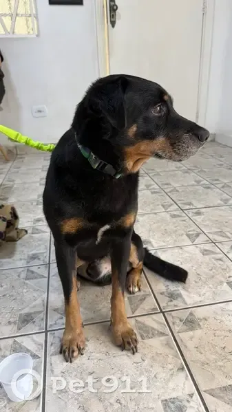 Cachorro SRD preto, bem cuidado, no máximo 5 anos. Encontrado com coleira de pescoço verde sem identificação. Ele estava com bastante dor na coluna e patinhas queimadas. Estava na frente de um prédio próximo ao Assai da Sezefredo Fagundes, zona Norte de SP.