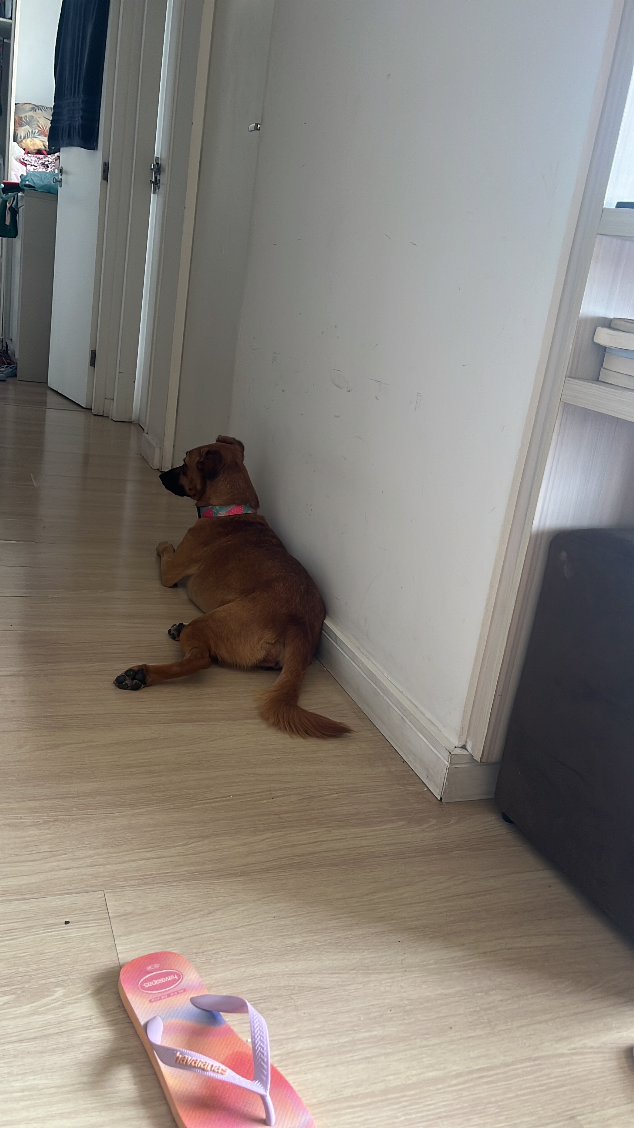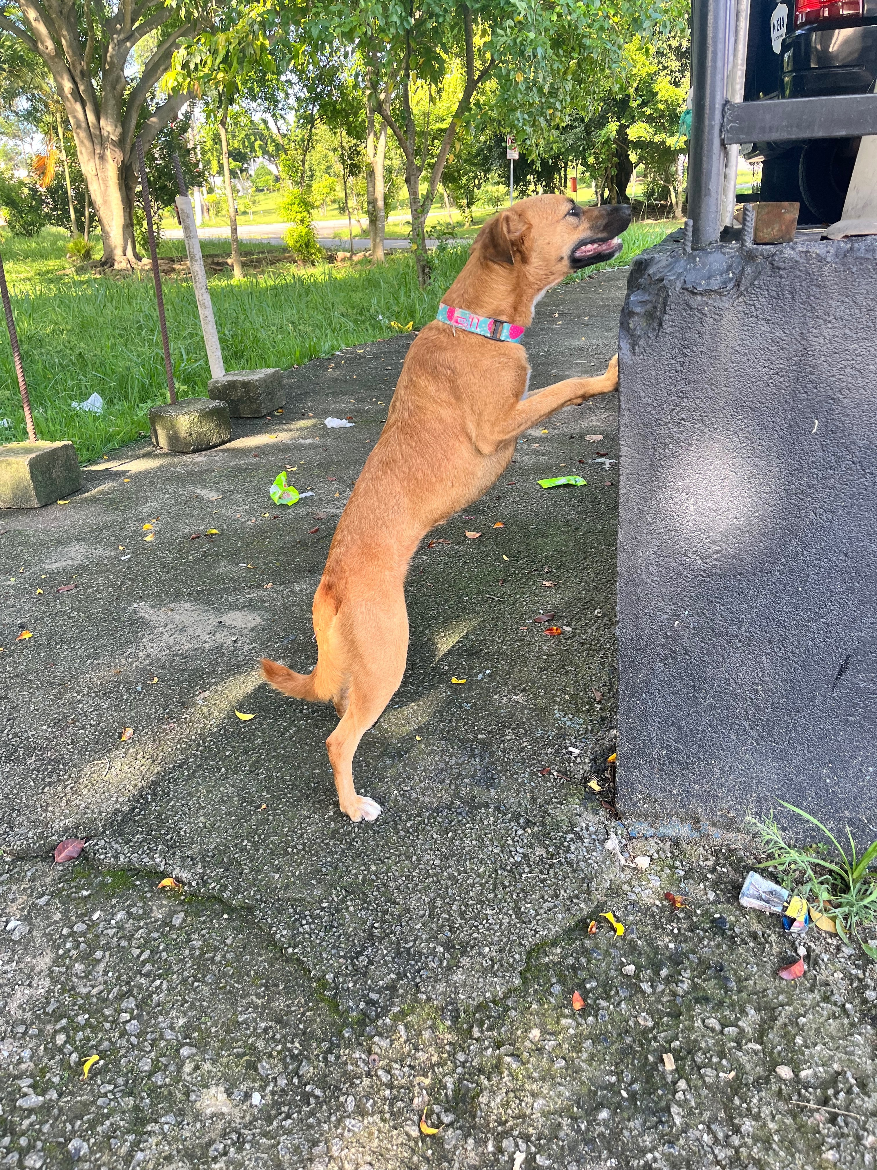 Cachorra fêmea, vira lata caramelo , estava com coleira rosa e azul, com pontos de castração . Estava correndo na rua, provavelmente fugiu de alguma casa. Estou com ela em casa.