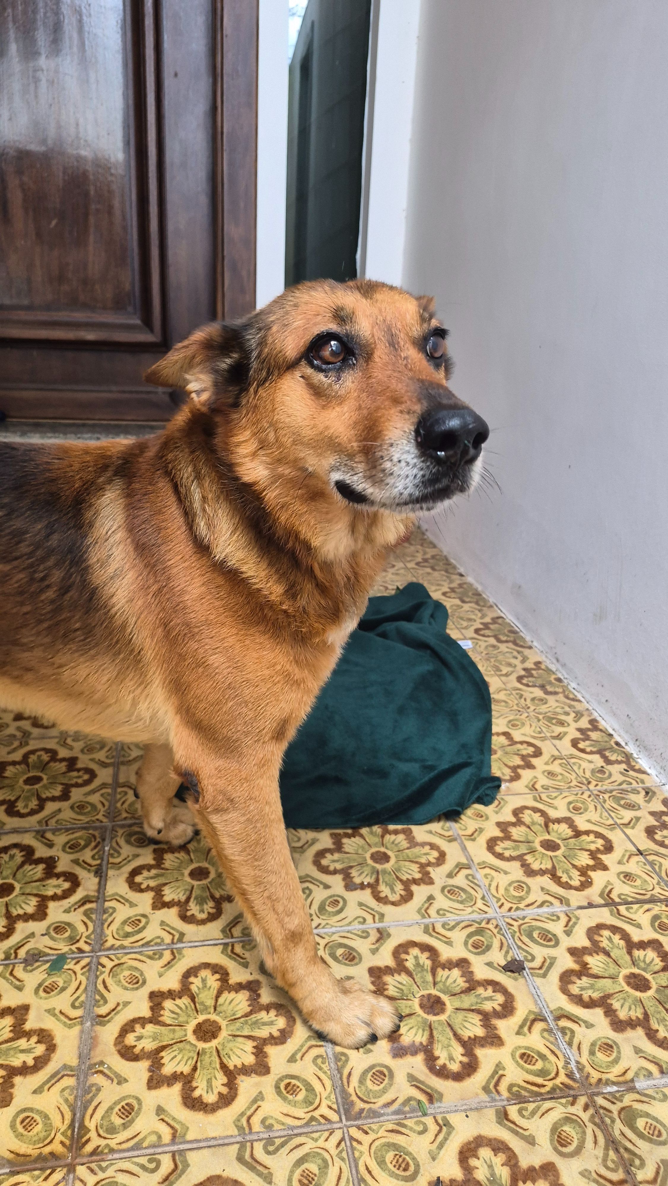 Ele tem porte médio, 21kg, caramelo com preto e alguns pelinhos brancos já. A veterinária disse que deve ter uns 5-6 anos. Muito carinhoso e adora ficar pulando na gente. O apelidamos de Chorar pois chorou as 2 primeiras noites inteiras.
