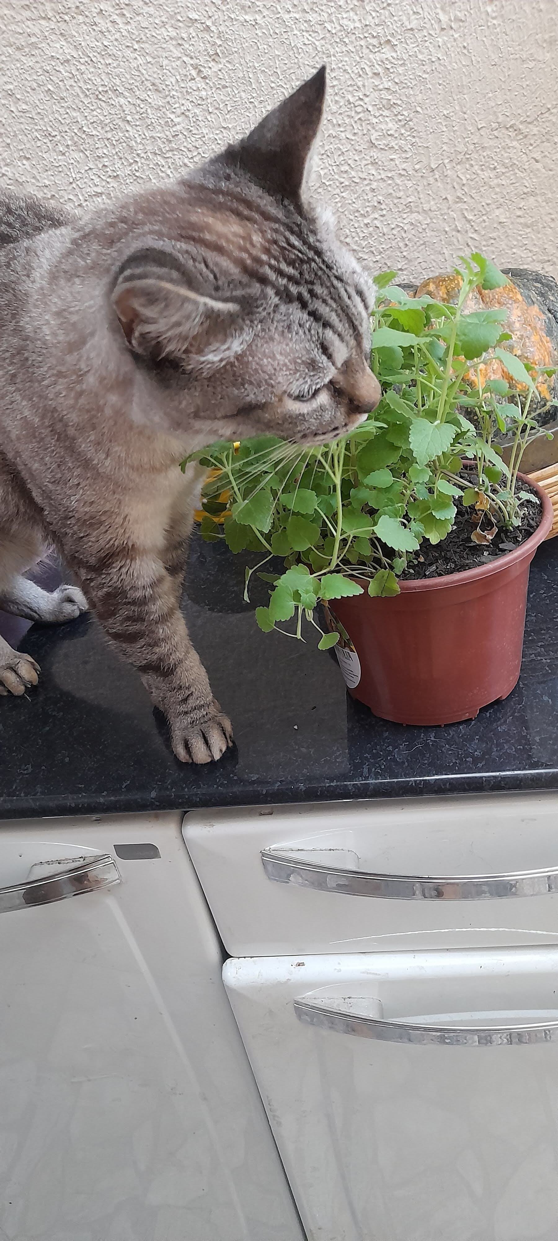 Cinza ,rajadinha. Olhos azuis, 14 anos, em tr...