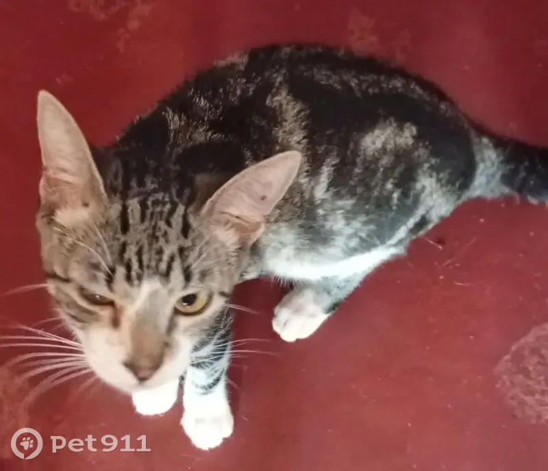 È una gatinha nova, rajada no preto cinza, como na foto, é uma gatinha ESPECIAL, ela não miagola( mia), caminha com dificuldades ela conseguiu subir no telhado e desapareceu. Ela está usando uma coleirinha no pescoço.
