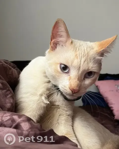 Garto de olhos azuis. Corpo branco/creme e rabo com ponta amarelada. Ele perdeu a coleira preta nas proximidades da rua da frente e está sem identificação. Pode ter uma leve marca clara no pescoço.