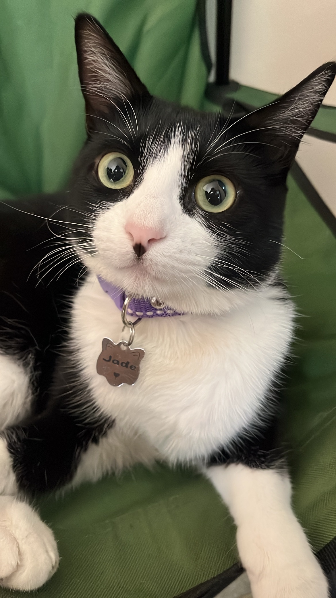 Branco e preta, Frajolinha, atende pelo nome Jade, está usando a coleira roxa como na foto que consta seu nome, telefone e nome da tutora Giovanna. É gordinha, porte médio e tem uma manchinha marrom no nariz.