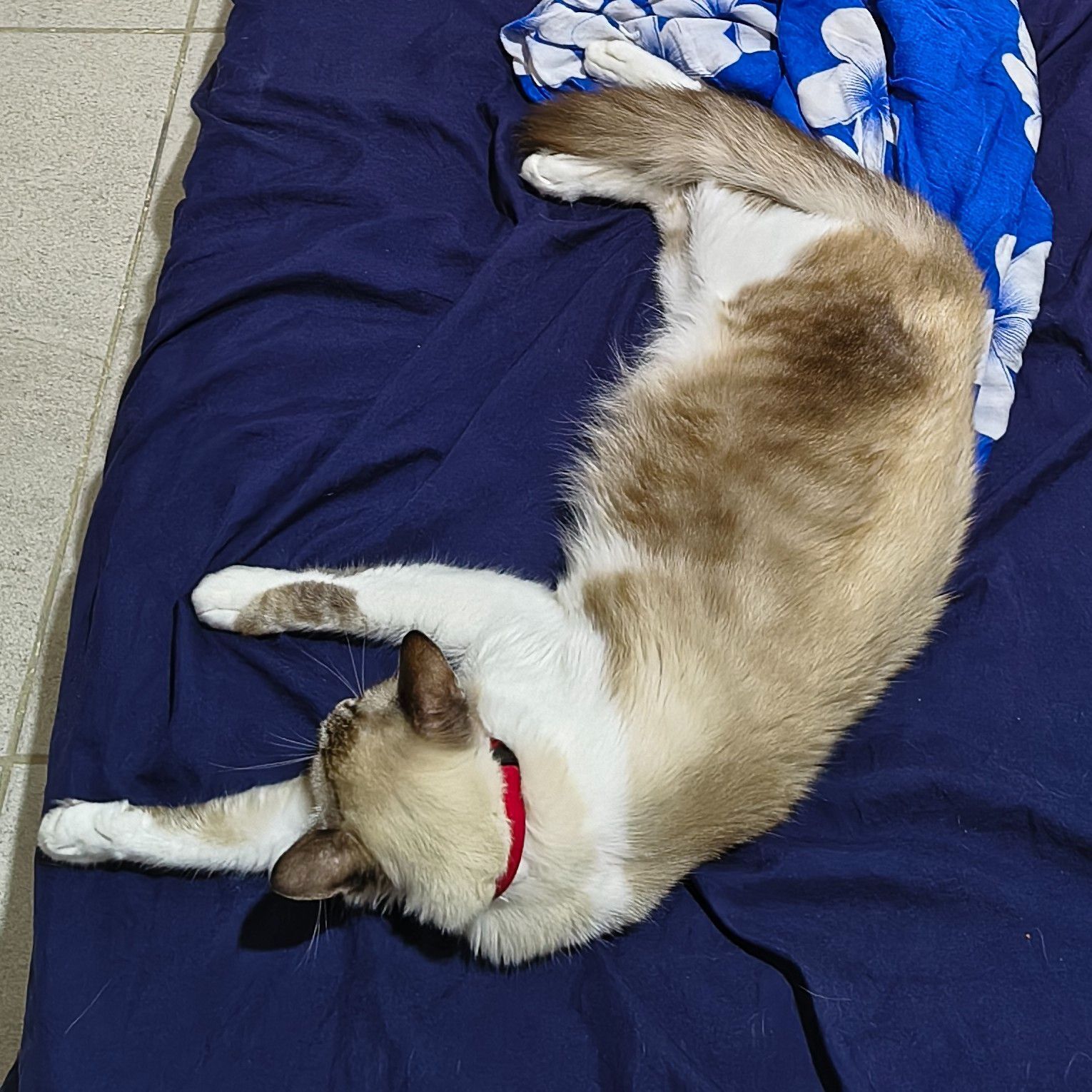 Branco com creme e manchas mais escuras levemente listradas com olhos azuis. Tem rabo peludo e uma marca característica no nariz. É manso e castrado, responde ao nome.
