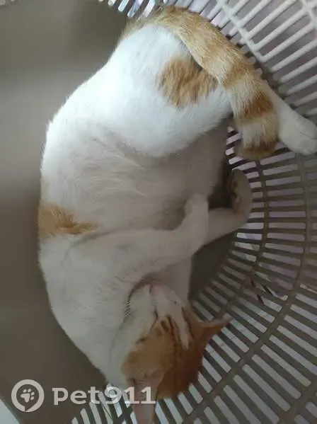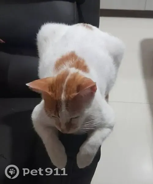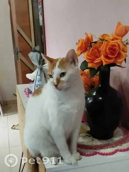Ele estava bem gordinho, nao apareceu pra jantar. Ele é branco com amarelo, tinha problemas com ração, nao comia qualquer uma por problemas de saúde. Ele é castrado, tem uma mancha sutil no focinho. Ele costumava ficar na laje de casa.