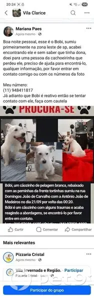 Esse é o Bobi, sumiu primeiramente na zona leste de sp, acabei encontrando ele e sem saber que tinha dona, doei para uma pessoa da cachoeirinha que perdeu ele, preciso de ajuda para encontrá-lo, qualquer informação, por favor entrar em contato comigo ou com os números da foto Meu número: (11) 948411817 Já adianto que Bobi é reativo então se tentar contato com ele, faça com cautela