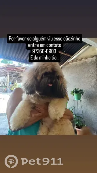 Ele é de pelagem media para longa, um tom de castanho e focinho preto, dócil bem cuidado. Saiu na rua e só demos falta por volta das 10hrs. Ele é da minha tia de 99 anos . Nos ajudem.