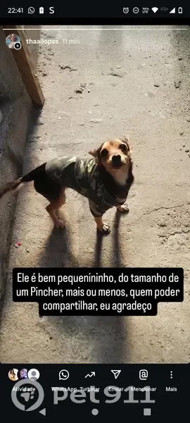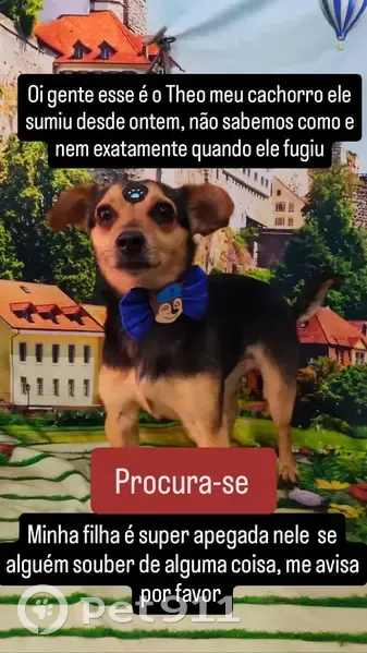 Ele parece um pinscher, é pequeno e dócil, atende pelo nome Theo, tem a pelagem preta e beje, está com 3 anos e meio Minha filha está sentindo falta dele