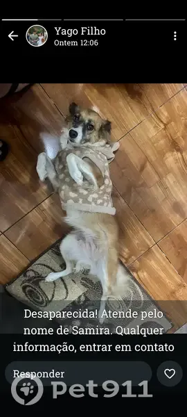 Samira tem a pelagem caramelo e branco, porte médio, muito dócil, não está acostumada com rua, sumiu por volta das 13:45 após minha nora deixar o portão encostado, ela tem muito medo de fogos de artifício