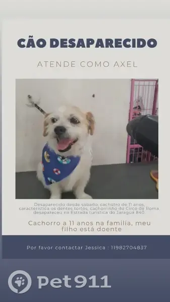 Cachorro misto, ilhasso com sem raça, branco com machinhas marron, baixo, pelo liso, dentinhos tortos e pra frente. Manso, atende pelo nome de Axel (vocalista do gan s rose). Cachorro fica solto, saiu no sábado e não voltou, já com certa idade, não tinha mais o costume de ir pra longe