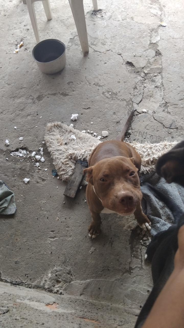 Marrom e branco , ele sumiu na madrugada do dia 17 de dezembro deixaram o portão aberto e ele saiu atrás dos outros pets ele é super dócil, brincalhão embora ele seja da raça pitbul mas é filhote tem 6 meses e é super manso