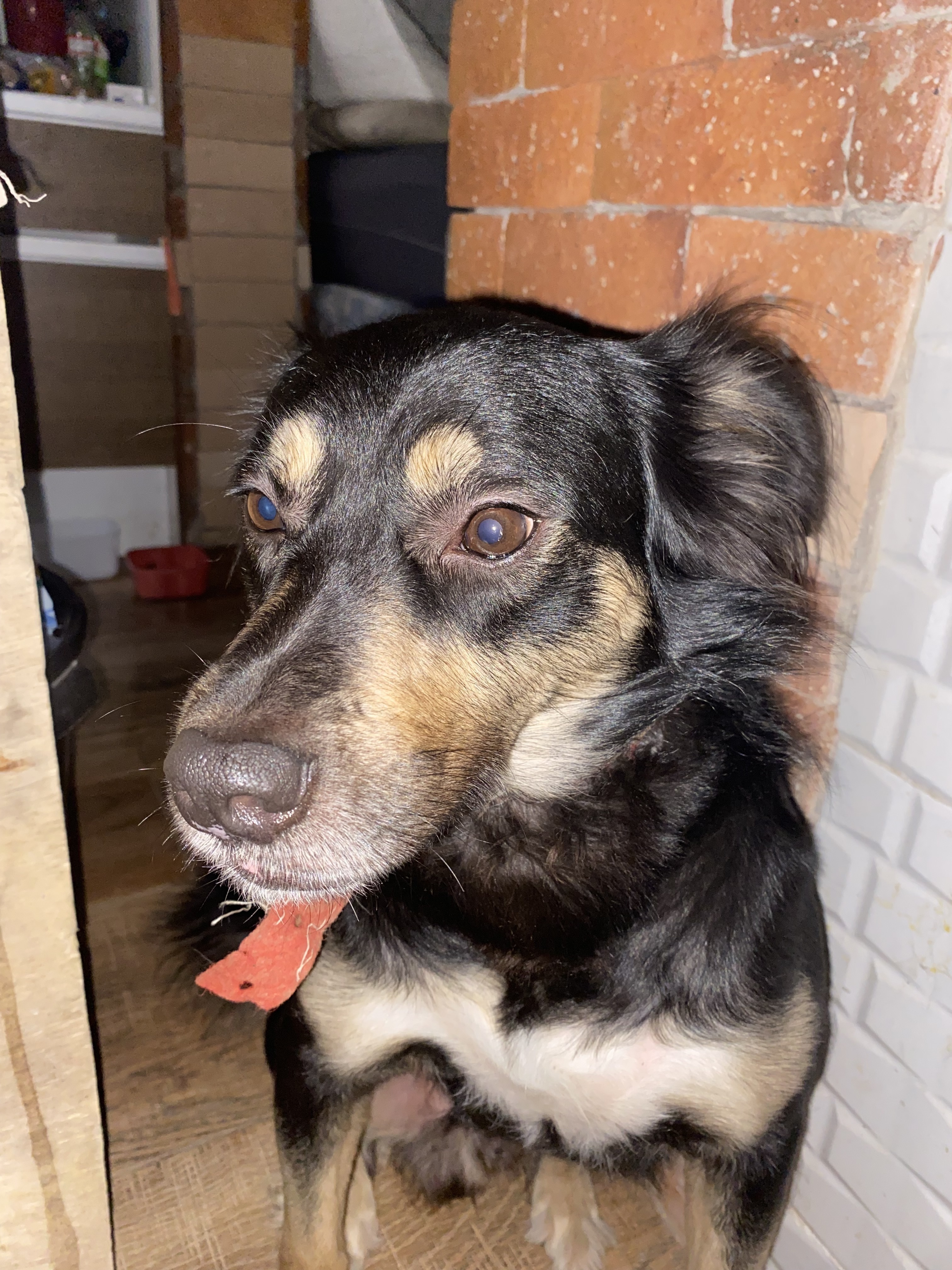 • Porte: médio • Raça: SRD (sem raça definida) • Cor: preto com manchas caramelo (sobrancelhas, focinho e pernas) • Pelagem: média, um pouco mais cheia no pescoço e orelhas • Orelhas: médias, caídas, com bastante pelo • Cauda: peluda • Coleira: preta, com vermelho embaixo • Temperamento: muito dócil, carinhoso, não avança, é um bebezão