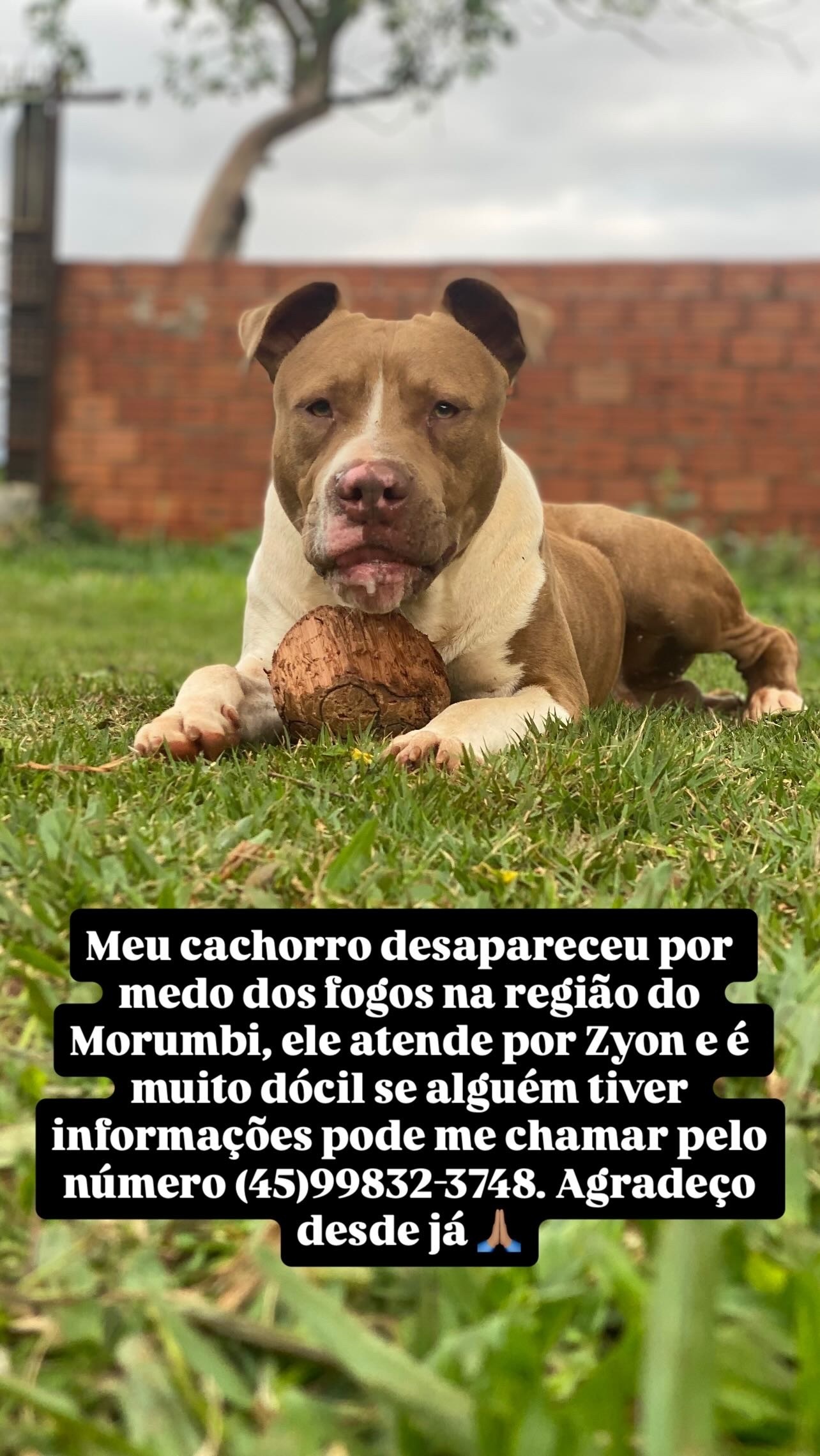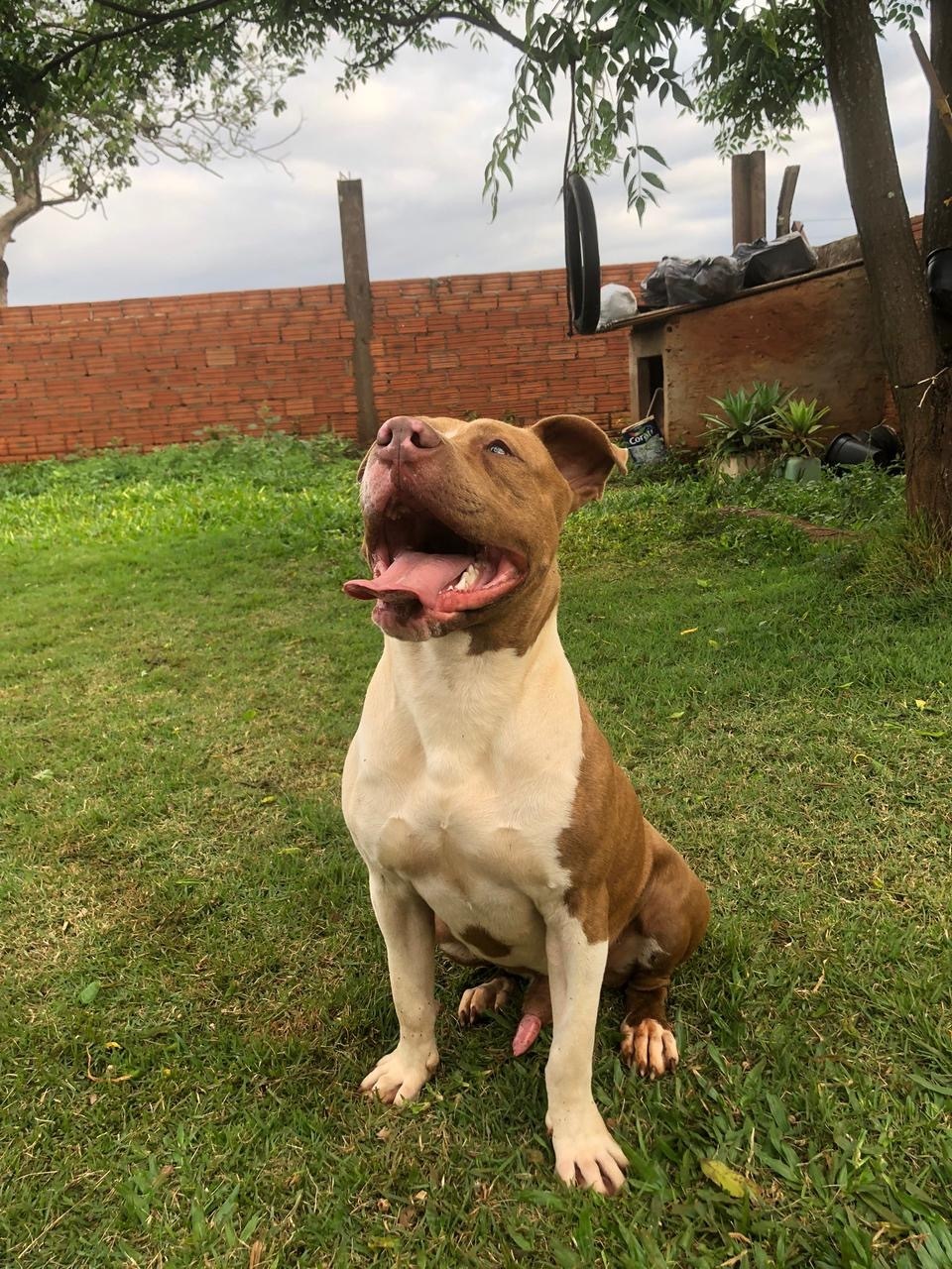 Ele tem a ponta do rabo branca, tem algumas marinhas bege na ponta do fucinho, ele é muito dócil e sofre de um problema crônico na perna, provávelmente vai estar mancando