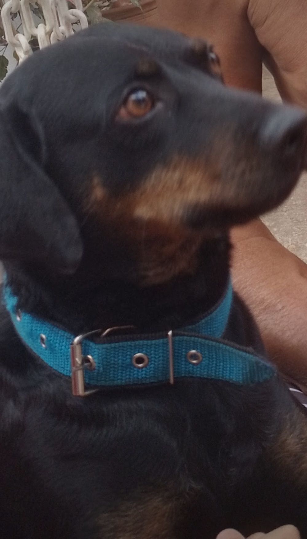 O Fred ele é dócil,tem muito medo de chuva,tem cor preta com algumas cores marrom no rosto e patas,e estava com 1 coleira amarela, ele saiu correndo atrás de um gato e não conseguimos alcançar, fomos atrás mas o Fred correu muito.