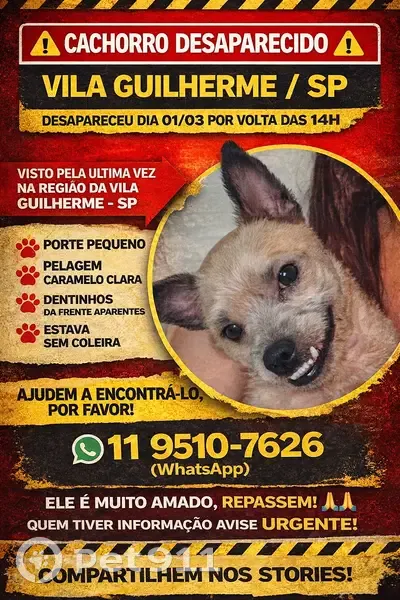 CÃO DESAPARECIDO – VILA GUILHERME / SP Colegas, peço ajuda na divulgação. O cãozinho Pingo desapareceu no dia 01/03 por volta das 14h na região da Vila Guilherme – São Paulo. Porte pequeno Pelagem caramelo clara Dentinhos da frente aparentes (característica marcante) Estava sem coleira Ele é extremamente dócil. Caso algum paciente com essas características dê entrada em clínica, hospital veterinário ou atendimento de emergência, por favor entrar em contato imediatamente: WhatsApp: 11 98510-7626 A família está desesperada. Agradeço imensamente qualquer apoio na divulgação