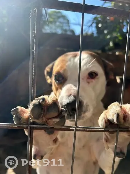 A preta e pote grande com os pelos esbranquiçados pois já vai fazer 13 anos, pata esquerda aberta perdeu tendos por causa de uma ferida. A branca tm manchas marrom na cabeca e rabo, mestiça pit bull porte grande, tm cataratas nos olhos.