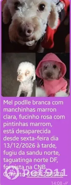 Podlle branca com manchas marrom clara, com focinho rosado com pintinhas marrom. Desapareceu dia 13/02/26, da praça CNF do Pet shop Tio Léo, se assustou e fugiu.