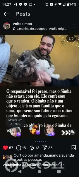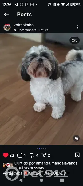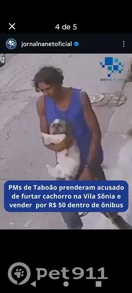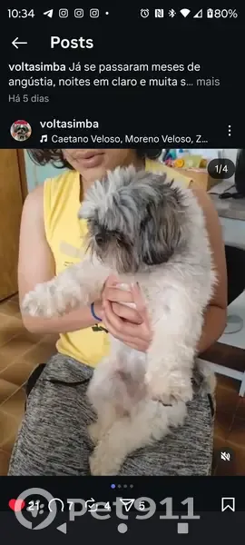 Simba é um Shitzu, porte pequeno, corpo branco, dorso cinza claro, orelhas pretas com mechas cor mel, região dos olhos escuro, tipo máscara, focinho/barba marrom. Ele foi roubada da garagem de casa dia 12/02/2026 e, segundo a polícia, vendido no Terminal de Ônibus Vl. Sônia, Zona Oeste, São Paulo, SP. O caso teve repercussão nacional, sendo publicadas reportagens em grandes veículos de imprensa, como Record, Band e Metrópolis. A família está a sua procura desde o dia de seu desaparecimento. O ladrão foi preso, mas ainda não temos informações sobre o paradeiro do Simba. Por favor, nos ajude.